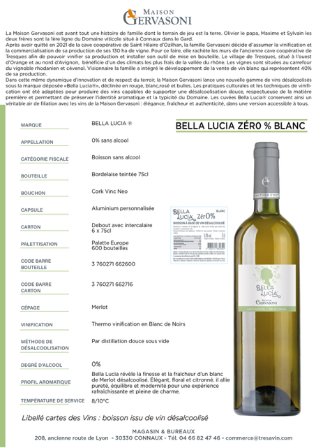 Bella Lucia révèle la finesse et la fraicheur d'un blanc de Merlot désalcoolisé. Elégant, floral et citronné, il allie pureté, équilibre et modernité pour une expérience rafraichissante et pleine de charme.