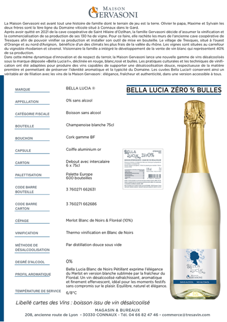 Bella Lucia Blanc de Noirs Pétillant exprime l'élégance du Merlot en version blanche sublimée par la fraicheur du Floréal. Un vin désalcoolisé rafraichissant, aromatique et finement effervescent. Idéal pour les moments festifs sans compromis sur le plaisir. Equilibre, naturel et élégance.
