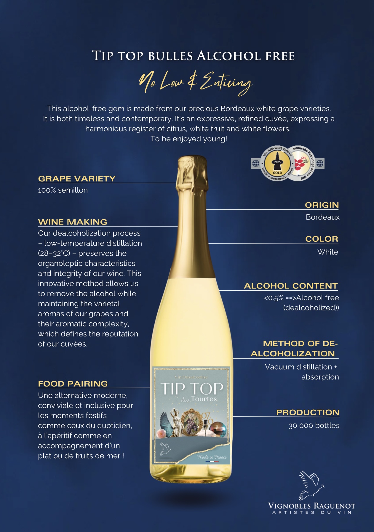 Cette pépite sans alcool est réalisée à partir d’un de nos précieux précieux cépages blancs bordelais (sémillon). Il est intemporel tout en étant très actuel. C’est une cuvée expressive et raffinée, qui s’exprime sur un registre harmonieux d’agrumes, de fruits blancs et de fleurs blanches.